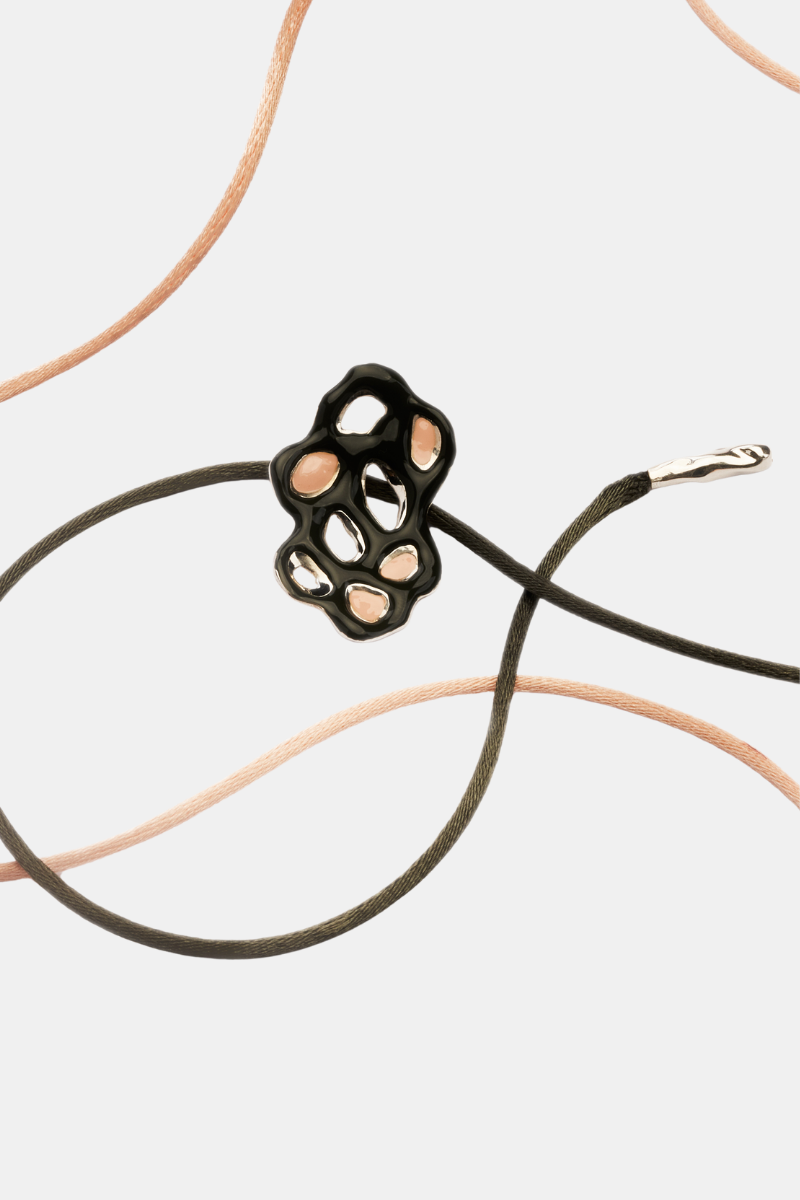 Necklace in 925 silver, enamelled in military green on the outside and pink on the inside.